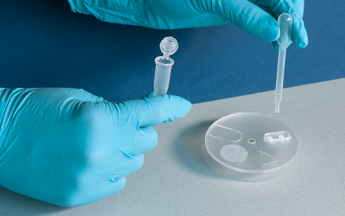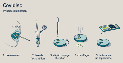 Le dispositif mis au point par l’équipe fonctionne en deux étapes : la première consiste à extraire l’ARN du virus sur une membrane (à partir d’un prélèvement de salive ou d’un prélèvement nasal), puis à amplifier le matériel génétique à température constante (méthode LAMP) sur une pastille prétraitée, pour ensuite détecter les produits d’amplification.