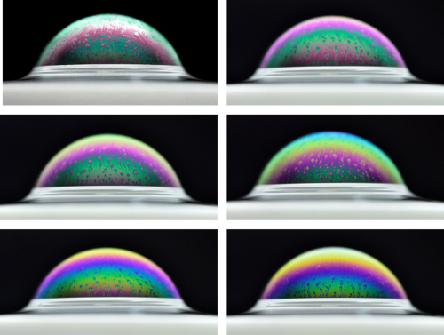 In this seminar, I will show that an automatic stability measurement under controlled atmospheric humidity allows to collect a large quantity of data and to demonstrate that the film lifetime is indeed fixed by the thinning through drainage and evaporation. A quantitative description allows to describe various soapy objects ranging from surface bubbles to giant soap films. Nevertheless, it necessitates to take into account convective evaporation and the impact of marginal regeneration (rising patches, which can be seen in the figure).