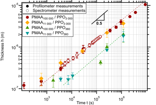 Dans cette nouvelle étude, ces chercheurs ont étudié la croissance de la membrane par spectrométrie pendant plusieurs semaines. Ils ont montré que son épaisseur croît lentement et de manière continue au cours du temps en suivant une loi de type diffusif. Le polymère se trouvant dans l’huile commence par s’assembler rapidement au polymère se trouvant dans l’eau pour former initialement une membrane très fine, de quelques nanomètres d’épaisseur. Par la suite, ce qui permet à la membrane d’atteindre des épaisseurs de plusieurs microns et donc de protéger durablement une émulsion, c’est la possibilité des chaînes libres de polymère d’une phase de diffuser à travers la membrane créée pour atteindre l’autre phase et ainsi se complexer avec leurs chaînes partenaires. Cependant la membrane étant composée d’un réseau très dense de chaînes de polymères déjà assemblées, la diffusion n’opère pas librement, mais est contrainte par des obstacles. Les chaînes doivent alors se déformer pour passer à travers les pores très petits du réseau enchevêtré. Il en résulte que la croissance est très lente et que sa vitesse dépend fortement de paramètres tels que la concentration en polymères ou la longueur des chaines qui contrôlent la structure du réseau constituant la membrane. De manière assez surprenante, l’équipe a en particulier observé que les chaînes de polymères les plus petites diffusaient moins vite que les longues chaînes à travers cette membrane. Ce résultat contre-intuitif est expliqué par le fait que la taille des pores créés dans la membrane est d’autant plus petite que les chaînes sont courtes, ce qui freine d’autant la diffusion des polymères. Outre la compréhension fondamentale des mécanismes microscopiques d’auto-assemblage des membranes, ces résultats permettront de développer des membranes ayant des gammes d’épaisseurs adaptées, pour mieux contrôler la durée de vie des émulsions industrielles.