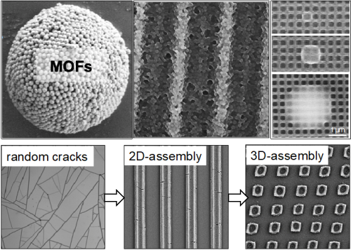 Inspired by the formation of cracks in mud, we demonstrate that cracks can be self-assembled into periodic patterns by controlling the evaporation conditions. Arrays of periodic cracks with several geometries can be obtain without defects over several square cm. In this configuration, cracks diffract lights and can be used as photonic platform for sensing (7). This “bottom-up” method was generalized to a large variety of solution-processed materials (such as oxides) and without any limitation in terms of substrate’s shape or dimension. This simple approach enables direct integration of nanomaterials into patterned devices without the limitations of the conventional lithographic techniques.