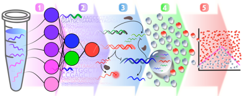 De gauche à droite - Une signature moléculaire (brins ADN ‘input’ rose et violet) est reconnue par un réseau de neurones artificiel (1). Cette architecture est encodée dans un réseau moléculaire composé de brins d’ADN (‘template’) (2). Le calcul s’opère par une série de réactions chimiques, catalysés par trois enzymes (marron) qui in fine, génère un signal fluorescent ‘output’ (rouge) si la signature moléculaire est reconnue (3). Ce type de calcul peut être opéré en parallèle dans des dizaines de milliers de gouttelettes microfluidiques, chacune réalisant le calcul sur une combinaison différente de brins ‘input’ (4). La fluorescence ‘output’ de chaque gouttelette est indexée par rapport à son contenu en brins ‘input’, révélant le résultat de la classification (5)