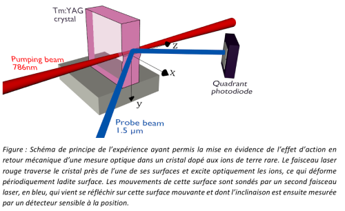 In previous work on a specific crystal, Tm:YAG, researchers noticed that continuous measurement of the state of atoms represented an extremely sensitive estimate of the locally applied constraints on the crystal [1]. Following the fundamental principles of quantum mechanics, such a measurement should necessarily be accompanied by a feedback effect, meaning the appearance of a constraint in the vicinity of the illuminated atoms. This hypothesis was very audacious: the evaluation of such an effect, never observed before, yielded very low values that would make its observation illusory, if not impossible.