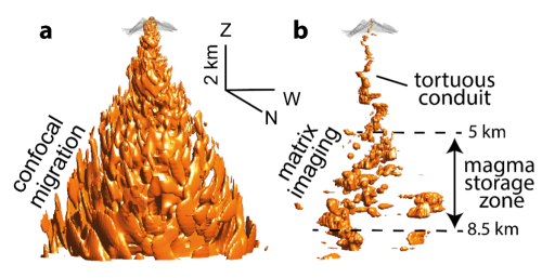 a. Vue tri-dimensionelle du volcan obtenue par une migration confocale de la matrice de réflexion. L’image obtenue est totalement brouillée pat les distorsions des ondes sismiques induites par les hétérogénéités du volcan. b Image matricielle du volcan obtenue par apprentissage des lois de focalisation compensant les hétérogénéités de ce dernier. Jusqu’à 5 km, l’image révèle le conduit tortueux de la Soufrière. Au-delà, une zone de stockage du magma est mise en lumière avers un arrangement complexe de lentilles de magma horizontales connectées les unes aux autres.