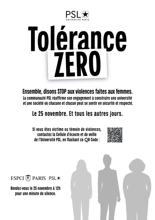 L’Université PSL et ses établissements-composantes dont l’ESPCI Paris – PSL se mobilisent pour lutter contre les violences faites aux femmes en observant une minute de silence à 12h le 25 novembre.