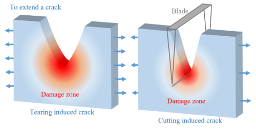 Lorsqu’un matériau mou est soumis à une force, il subit d’importantes déformations près de la pointe de la fissure, un phénomène appelé émoussement. Cette déformation induit la rupture d’un grand nombre de liaisons moléculaires, nécessitant beaucoup d’énergie pour propager une fissure par déchirure. A contrario, utiliser une lame réduit nettement l’émoussement en localisant la déformation sur une zone restreinte, limitant ainsi les dégâts au réseau moléculaire.