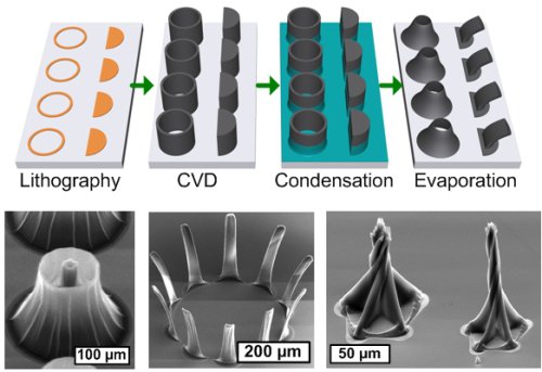 Carbon nanotubes (CNTs), as well as graphene, have been pivotal in captivating the interest of scientists, the general public, and industry in nanotechnology. The latter can best be quantified by the production capacity of CNTs which is growing exponentially, and is currently estimated at 5000 ton/yr. However, few methods currently exist to shape these nanomaterials into organized microstructures.
