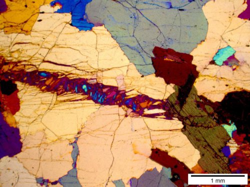 Microphotographie d’une lame mince de granite prise sous lumière polarisée . L’échantillon de granite a été rompu sous compression avec confinement. L’axe de compression est horizontal. On distingue au centre la zone de cisaillement, ou faille, constituée par la jonction de nombreuses micro-fractures et dont la formation a déclenché la rupture macroscopique. Ce mécanisme de formation des failles par interaction entre microfractures est à l’origine des effets d’échelle sur la résistance mécanique sous compression. © Anne-Marie Boullier / IsTerre