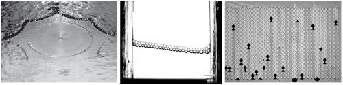 Figure : From left to right : a polygonal hydraulic jump, two layers of bubbles on a sloshing liquid and clogs in parallel micro-channels.