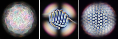 Omniprésents dans les technologies d’affichage, les cristaux liquides sont partout autour de nous. Ce sont des fluides ordonnés et anisotropes, dotés d’une forte biréfringence et d’une élasticité d’orientation. Il y a trente ans, les progrès en synthèse chimique ont permis aux ingénieurs de leur donner une application révolutionnaire, et un prix Nobel de physique est venu couronner leur compréhension fondamentale. Mais l’histoire ne s’est pas arrêtée là. Aujourd’hui, ils sont devenus le terrain de jeu par excellence pour combiner matière molle et topologie, afin d’établir des analogies avec d’autres domaines fondamentaux de la physique, ou d’imaginer des matériaux artificiels aux capacités exotiques. Par exemple, des cristaux liquides ne peuvent pas remplir un espace ayant la topologie d’une sphère sans créer de défauts dans leur agencement. Dans cette thèse, nous fabriquons, manipulons et observons des coques de cristaux liquides – des doubles émulsions qui confinent les cristaux liquides à une géométrie sphérique entre deux phases aqueuses. Nous commençons par présenter un mécanisme inédit de contrôle par la température de l’orientation des molécules à une interface eau / cristal liquide. Nous appliquons ensuite ce mécanisme à des coques cholestériques, dans lesquelles les molécules de cristal liquide s’organisent en hélice. Cet agencement est incompatible avec des changements d’orientation aux interfaces : le système se retrouve frustré, et soulage cette frustration en formant des bandes ou des stries. Enfin, nous examinons des situations où la frustration est telle que les hélices sont forcées de se dérouler presque partout, sauf dans des structures solitoniques comme des doigts cholestériques ou des skyrmions. Nous étudions à la fois des transitions dynamiques entre ces objets et leur organisation en géométrie courbe.