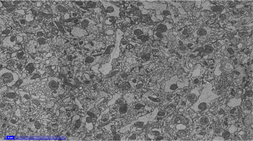 Fig: This picture illustrates the recording of a drosophila brain by electron microscopy. The whole dataset is made of 7062 sections, and each section contains ~800 pictures like this one. Complete dataset available at https://catmaid-fafb.virtualflybrain.org