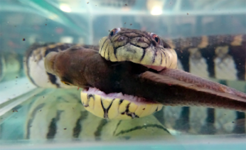 Sous l'eau, le serpent peut projeter sa tête en avant pour capturer une proie.