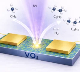 © Alexandre Zimmers Conversion photocatalytique du méthane en hydrogène et alcanes légers à la température de la transition isolant-métal du VO₂ (68°C). Cette transition se caractérise par la formation de domaines isolants (verts) et métalliques (bleus) à l'échelle micrométrique. Transformer le