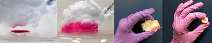 La mousse gélifiée est mise en contact avec un liquide coloré, puis l’absorbe en quelques instants. La mousse est séchée puis elle est comprimée jusqu’à occuper le plus petit volume possible.