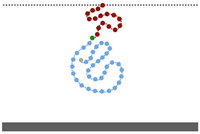 Figure 2 : Près d'une interface libre (tirets), une molécule (verte) peut se déplacer à l'aide d'une chaîne coopérative (bleue) dans le cœur du matériau, mais elle peut alternativement le faire au travers d'une chaîne (rouge) tronquée par l'interface – plus courte donc plus probable – ce qui accroît la mobilité de surface et réduit la température de transition vitreuse effective.