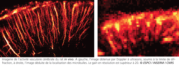 Les chercheurs décident alors d’utiliser un agent de contraste, ici des microbulles de 3 µm de diamètre déjà employées dans le domaine médical. Après plusieurs années de recherche en collaboration avec une équipe de neurobiologie (ESPCI/CNRS) dirigée par Zsolt Lenkei, directeur de Recherche Inserm, ils parviennent à injecter ces multitudes de microbulles dans une veine d’un rat. La cadence ultrarapide d’acquisition de 5000 images par seconde permet d’extraire de manière très précise le signal individuel provenant de chaque microbulle du bruit de l’ensemble des signaux rétrodiffusés. Leurs positions uniques peuvent alors être localisées individuellement par ultrasons avec une précision micrométrique lors de leur passage dans le cerveau.