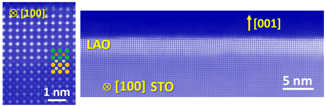 Cliché de microscopie électronique de l’interface entre SrTiO3 (STO) en gris foncé en bas, et LaAlO3 (LAO) en gris clair en haut. Le grossissement à gauche montre la position des atomes qui s’organisent sur un réseau de base carrée. Les électrons s’accumulent juste à l’interface entre les deux matériaux. [G Herranz et al., Nature Communications 6, 6028 (2015)]