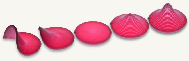 Actionnement d’un baromorphe de géométrie très simple : la variation de la pression interne induit le passage continu d’une chips à un plat à tajine, en passant par le disque plan.