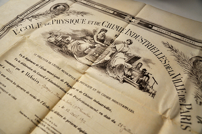 Diplôme de G. Urbain, à l'ESPCI. Don de la famille au CRH de l'école.
