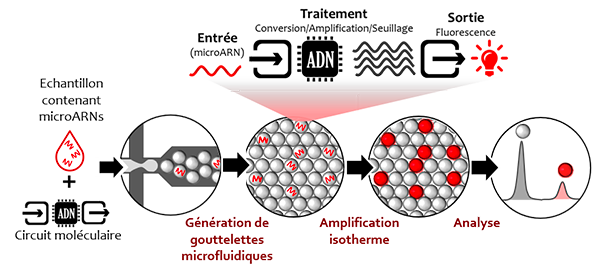 Spécialiste des circuits moléculaires, Yannick Rondelez explore depuis plusieurs années la réalisation de réseaux de réaction biochimiques pour effectuer des tâches complexes. D’un concept fondamental, lui et son équipe du laboratoire Gulliver à l’ESPCI Paris sont parvenus à mettre au point un circuit moléculaire capable de détecter, d’amplifier, et de signaler par fluorescence la présence de microARNs. Ce test, applicable aux biopsies liquides, est basé sur un effet de seuil dynamique, qui permet de s’affranchir des faux positifs.