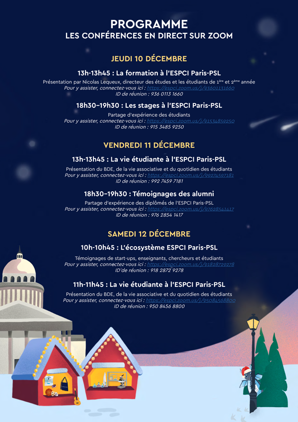 Les 10, 11 et 12 décembre, l’ESPCI Paris-PSL ouvre ses portes en ligne. Pour l’occasion, unportail spécifique sera ouvert : zooms thématiques, vidéos témoignages, ne ratez pas l’occasion de découvrir les secrets d’une école d’ingénieurs unique dans le paysage français.