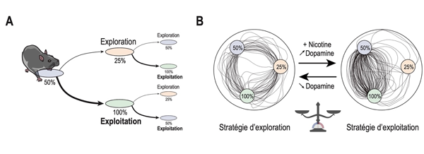 (B) Exemples de trajectoires d’animaux après plusieurs essais, et stratégies associées. Choisir systématiquement l’option de plus forte valeur en termes de probabilité de récompense revient, pour la souris, à alterner préférentiellement entre les zones 100% et 50% : c’est la stratégie « d’exploitation » (à droite). À l’inverse, varier ses choix entre les trois aires définit une stratégie « d’exploration » (à gauche). Une exposition chronique des souris à la nicotine augmente l’activité des neurones dopaminergiques et oriente ces animaux vers un profil plus « exploitant ». En augmentant ou en diminuant directement l’activité de ces neurones par une technique optogénétique, il est également possible d’orienter la prise de décision vers une stratégie plus exploitante ou plus exploratoire, respectivement.