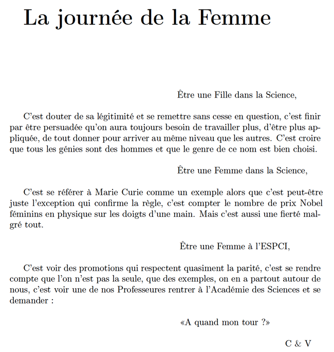 IngénieurEs de la 136ème promotion, Cécile et Valentine sont en 4ème année, donc de spécialisation. Elles nous livrent, une réflexion vive à la fois critique et enthousiaste.