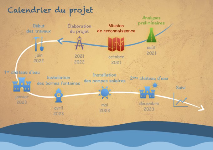 En aout 2021, les associations ont réalisé des analyses chimiques et bactériologiques de l’eau, ainsi que des essais de pompage. Par la suite, en juin 2022, les travaux commenceront par la construction d’un premier château d’eau. Des formations et sensibilisations seront faites en amont de sa mise en service, ainsi que la formation d’un comité de gestion devant s’assurer de la viabilité technique et économique des infrastructures. Le deuxième château d’eau, dont la livraison est prévue fin 2023 - début 2024, viendra clôturer le projet en approvisionnant complètement le village.