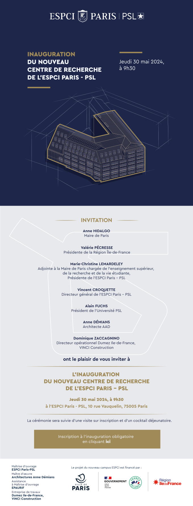 Inauguration du nouveau centre de recherche ESPCI Paris - PSL, le jeudi 30 mai 2024