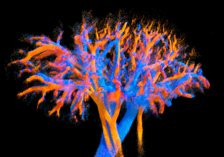 Visualisation 4D de la vascularisation d’un rein entier obtenue grâce à la sonde multi-lentille développée dans cette étude. Les veines sont représentées en bleu et les artères en rouge. Les variations de couleur indiquent la vitesse du flux sanguin : plus la couleur est vive, plus le sang circule rapidement. Les plus petits vaisseaux font moins de 100 micromètres. ©Alexandre Dizeux