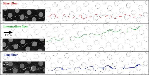 L’étude s’intéresse au transport de fibres flexibles dans un une forêt de micro piliers organisés selon un réseau incliné par rapport à la direction de l’écoulement. Ce type de géométrie est à la base du principe du « déplacement latéral déterministe », couramment employé pour trier des particules sphériques par leur taille. Ici, les chercheurs combinent expériences sur des filaments d’actine, des fibres biologiques souples de quelques dizaines de micromètres, et simulations numériques détaillées pour explorer et comprendre comment la flexibilité et la longueur des fibres modifient leur trajectoire.