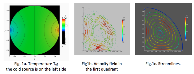 in polar coordinates, r and θ ; the constants (temperatures) depend on the imposed gradient (Fig.1a), and it is the only case where a static solution can exist. For a slight inclination of the cell, the projection of gravity in the plane of the cell can be used as a perturbation parameter ; the equations can be solved analyticaly to first order in perturbation theory, without recourse to the Boussinesq approximation (Fig.1 b,c). Furthermore, numerical simulations using a lattice-Boltzmann approach are carried out, as well as a numerical analysis of the equations. We discuss the experiments and the theoretical results.